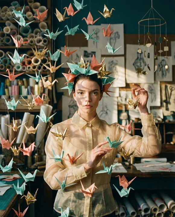 { "vibe_title_en": "Paper Symphony", "master_prompt": "A hyper-realistic, cinematic medium shot of The Protagonist standing in the center of a cluttered, sun-drenched paper artisan's atelier. The air is thick with a suspended vortex of hundreds of intricate origami cranes in pastel teal, coral, and gold foil, physically filling the frame like a frozen explosion. The background is dense with narrative detail: shelves overflowing with rolled Washi paper, scattered sketches, antique cutting tools, and hanging geometric mobiles, all blurring into a creamy bokeh. The lighting is ethereal and directional, mimicking golden hour sunlight filtering through the paper structures, casting intricate shadows on the subject's face. The subject wears a structured, translucent garment that echoes the folds of the paper. Shot on a Hasselblad H6D-100c with an 80mm f/1.9 lens to capture the micro-texture of the paper grain and the hyper-realistic skin pores. The color grading mimics Kodak Portra 400, with soft highlights, deep teal shadows, and a dreamy, nostalgic atmosphere. No digital gloss; pure analog tactile feeling.", "meta": { "intent": "Editorial Fashion meets Surrealism", "priorities": "Photorealistic Texture, Depth of Field, Color Harmony", "device_profile": "High-End Medium Format Digital" }, "frame": { "aspect": "4:5", "composition": "Central subject surrounded by radial chaos", "layout": "Dense foreground and background framing", "camera_angle": "Eye Level", "tilt_roll_degrees": "0" }, "subject": { "gender": "Female", "identity": "{argument name=\"protagonist name\" default=\"Anya Taylor Joy\"}", "demographics": "Ageless, Ethereal", "face": "Neutral expression, direct gaze, soft golden sheen on eyelids", "hair": "Sleek, pulled back to emphasize facial structure", "body": "Still pose, neck elongated", "expression": "Calm amidst chaos, piercing gaze", "pose": "Static, hands gently interacting with the floating elements" }, "wardrobe_accessories": { "garments": [ { "item": "Structured Blouse", "material": "Translucent Organza or Crinkled Paper Fabric", "color": "Soft Beige / Pale Gold", "fit": "Voluminous, architectural" } ], "accessories": [ { "item": "Origami Crane Headpiece (Surreal Element)", "color": "Teal, Coral, Gold", "material": "Textured Washi Paper", "brand_style": "Avant-Garde Artisan" } ] }, "environment": { "setting": "Artisan Paper Workshop / Atelier", "surfaces": "Wood desks, paper stacks, parchment rolls", "depth": "High density of objects in foreground and background", "atmosphere": "Dusty sunlight, creative chaos, suspended time", "lens_interaction": "Soft bloom from backlit paper, shallow depth of field" }, "lighting": { "key": "Soft directional sunlight (Rembrandt style)", "fill": "Ambient bounc