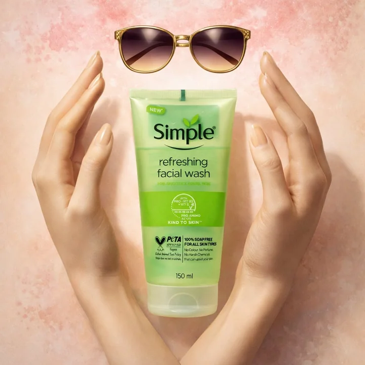 Ultra-Realistic Promotional Surreal Minimal Beauty Composition on a soft peach background with a pink watercolor texture at the top. Two elegant female hands painted in a matte nude-beige color, forming a symmetrical curved shape framing empty space. Floating above the hands are sunglasses. Below the sunglasses: glossy metallic gold lips, floating without a face. High-fashion editorial style, clean lighting, smooth shadows, aesthetic surrealism, pastel tones, elegant composition, luxury product photography mixed with artistic collage.