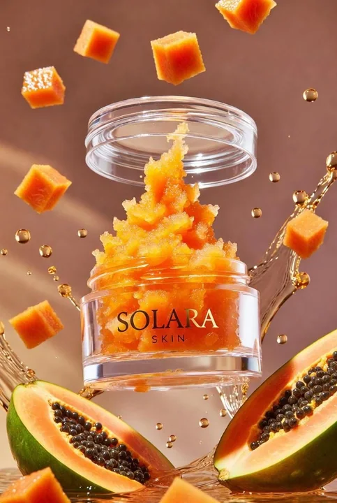 Hyperrealistic luxury product photography of a transparent cosmetic jar labeled "SOLARA SKIN" papaya glow scrub floating mid-air, lid suspended above. Vibrant orange whipped scrub erupts upward with juicy texture, surrounded by papaya cubes, halved papayas, and golden droplets frozen in motion. Centered macro view, cinematic studio lighting from above, glowing highlights, shallow depth, warm nude gradient background, premium skincare advertising, crisp 8K realism.