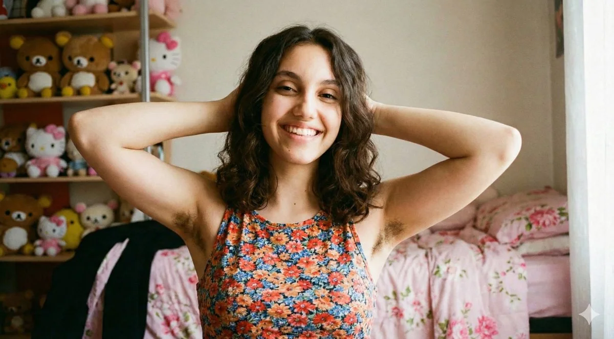 { "image_generation_prompt": { "subject": { "person": "20 岁出头的年轻女性", "ethnicity": "地中海或拉丁裔外貌", "features": "波浪形深棕色中长发,暖色调肤色,真诚友好的笑容,直视镜头", "pose": "双手置于脑后,手肘向外,露出自然的腋毛", "body_hair_detail": "可见的、自然的、未剃的腋毛,以倡导身体自爱" }, "clothing": { "item": "无袖花卉背心", "pattern": "小而密的植物印花,带有橙色、红色、蓝色和白色花朵", "fit": "舒适、休闲的夏日穿着" }, "environment": { "setting": "舒适的卧室内部", "background_elements": [ "摆满各种毛绒玩具和填充动物的架子", "可辨认的毛绒玩具,如轻松熊(Rilakkuma)和凯蒂猫(Hello Kitty)", "背景中带有粉色和白色花卉图案床品的床", "柔和、凌乱、充满生活气息的美学" ] }, "technical_specs": { "lighting": "侧面射入的柔和自然日光,温暖的室内氛围", "camera": "使用 35mm 镜头拍摄,f/1.8", "depth_of_field": "浅景深,主体清晰对焦,背景柔和模糊(散景)", "style": "超写实、高分辨率、电影感肖像、抓拍风格", "aspect_ratio": "21:9 或 2:1(宽幅电影画幅)" }, "mood": "自信、自然、舒适、真实" } }