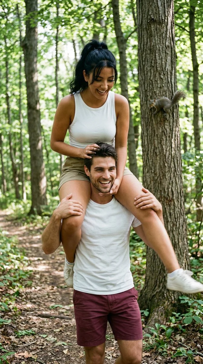 "notes": "Forest path. The man carries the woman on his shoulders; they laugh. On a tree trunk in the background, a squirrel pauses and watches (subtle cameo). Photoreal candid motion, slight motion blur on limbs, faces sharp. No text/logos/watermark."