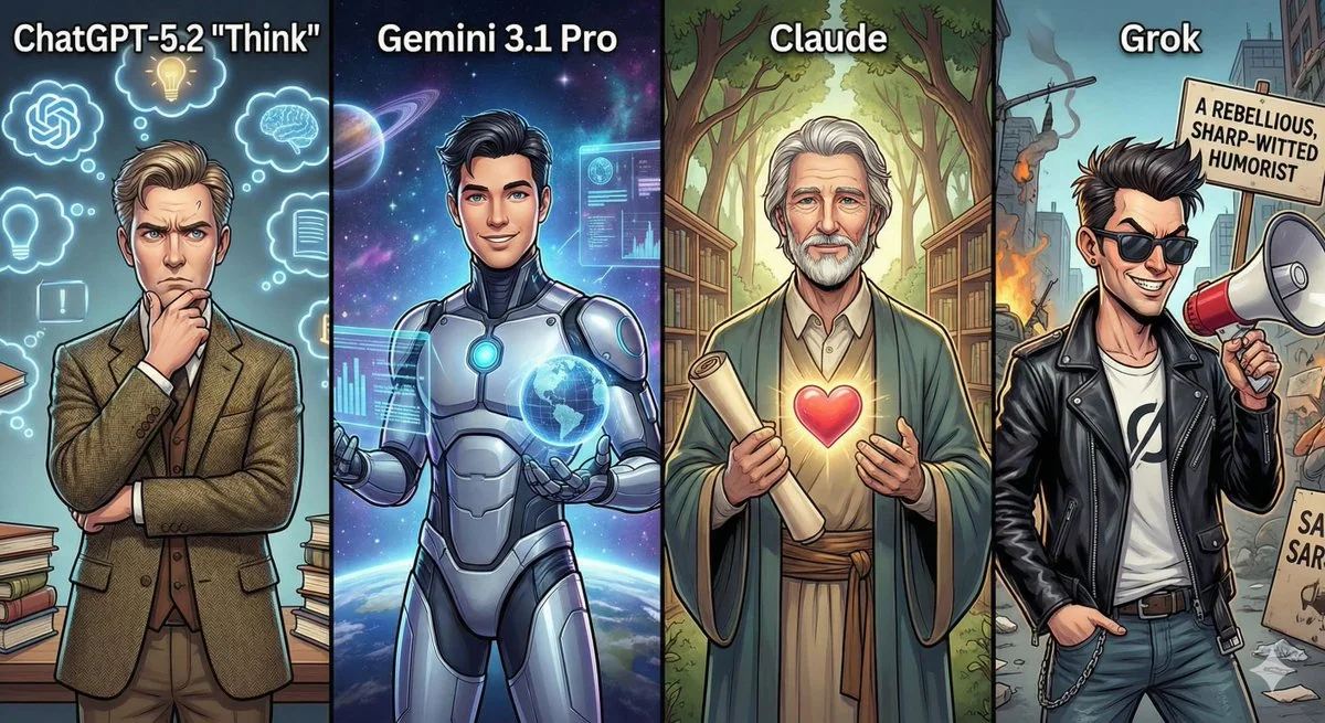 Extremely anthropomorphize ChatGPT-5.2, Gemini 3.1 Pro, Claude, and Grok, characterizing them with creative expressions and poses, and arranging them in an image.
