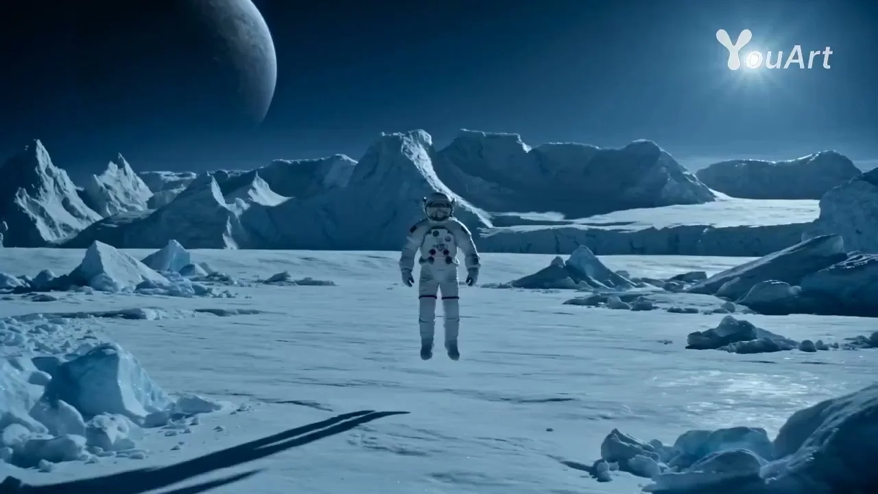 A lone astronaut in a standard spacesuit lands on a frozen exoplanet covered in endless glaciers under a dim blue sun. Slow cinematic shot: he removes his helmet, cold vapor fills the air, his skin gradually turns translucent and crystalline, veins glow icy blue, body develops thick insulating blubber and frost-like scales, eyes become multifaceted like ice crystals, until he becomes a graceful ice-adapted humanoid gliding across the surface. Ultra-realistic, slow transformation, dramatic lighting.