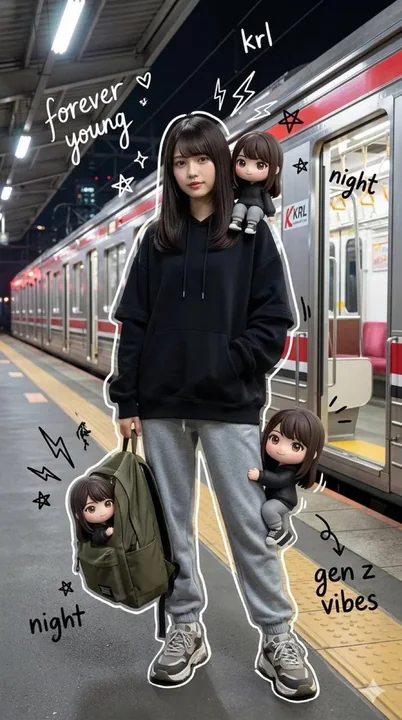 High-quality mixed media portrait. A trendy Gen Z teenager (using a photo of the person I uploaded) standing on a night train station platform. The subject poses coolly, holding the strap of an olive-colored backpack with one hand. The clothing is fashionable Gen Z style (oversized streetwear, layered black hoodie, gray sweatpants, chunky sneakers). In the background, a realistic side view of a "KRL Jabodetabek" commuter line train is depicted, featuring characteristic red stripes. The train doors are wide open, illuminated by bright, cinematic station lighting and the atmosphere of a city night. Multiple cute 3D-style "chibi" versions appear around the realistic main subject, wearing the same clothes and having the same face. The chibis are playfully interacting: - One is sitting on the shoulder - One is climbing on the foot - Another is peeking out from the backpack Overlay vibrant hand-drawn doodle effects across the entire image: White hand-drawn outlines surrounding the subject, playful scribbles, stars, glitter, light sparks, and floating black and white handwritten slogans such as "forever young", "krl", "night", "gen z vibes". The style is a seamless fusion of hyper-realistic photography and colorful, flat cartoon illustrations. The face and the silhouette/shape of the person are preserved exactly as they are, without any changes.