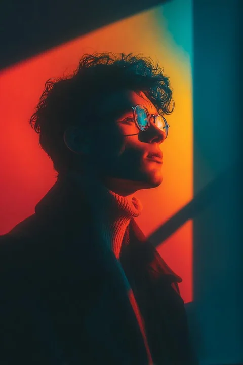 Cinematic portrait of a stylish young person wearing round glasses, standing beside a wall illuminated by bold geometric window light. Strong red, orange, and teal color contrast casting dramatic shadows across the face. Side profile pose, soft contemplative expression, sharp focus on facial features. High contrast lighting with hard-edged rectangular light shapes in the background. Moody atmosphere, artistic color blocking, modern editorial photography style. Shot on 85mm lens, f/1.8, ultra-detailed skin texture, shallow depth of field, dramatic rim lighting, 8K resolution.