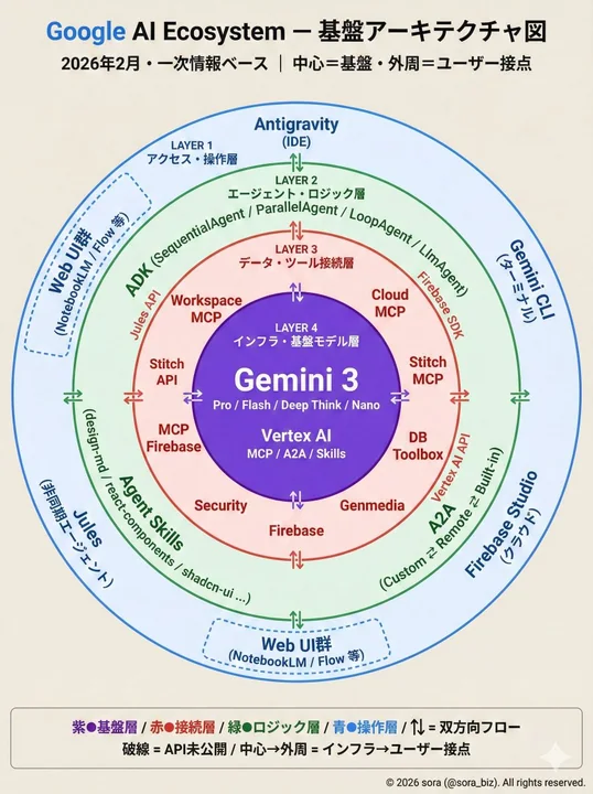 Google AI 生态系统根据主要信息分为四层结构。仅凭工具无法看到全貌。MCP、ADK 和 Antigravity 如何围绕 Gemini 连接。