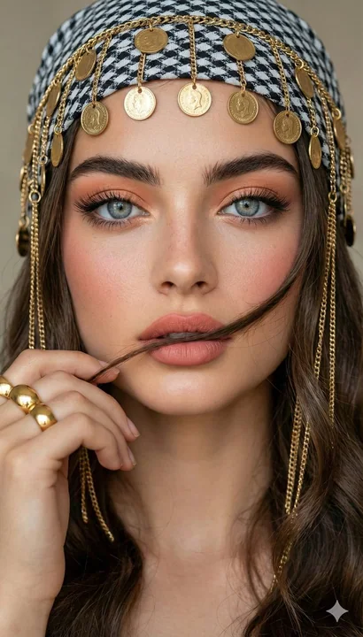 Convert the uploaded image into A stunning woman in a close-up portrait pose. holdina a strand of her wavy browr hair in fror t of her lips. She has captivatinc grey-blue eyes, soft glam makeup with peach eyeshadow, long lashes, bolc eyeliner, rosy blush, and peach-pink matte lips. She is wearing a black-and-white patterned headscarf decorated with hanging gold coins and chains. Long gold chain earrinas frame her face. She wears a chunky gold ring on her finger, clearly visible as her hand is lifted near her face Background is neutral, softly blurred beige tones. Ultra-realistic, 8K detail, sharp focus on eves, smooth skin texture cinematic lighting. face features remain the same. 将上传的图片转换为一位特写肖像姿势的惊艳女性。她用手轻抚一缕波浪状的棕色头发,置于唇前。她拥有迷人的灰蓝色眼睛,柔和的魅力妆容,包括桃色眼影、浓密睫毛、大胆眼线、玫瑰色腮红和桃粉色哑光唇。她戴着一条黑白图案的头巾,上面装饰着悬挂的金色硬币和链条。长长的金链耳环勾勒出她的脸庞。她的手指上戴着一枚粗大的金戒指,当她的手抬到脸旁时清晰可见。背景是中性柔和的米色调,模糊处理。超现实主义,8K 细节,眼睛锐利聚焦,皮肤纹理光滑,电影级光线。面部特征保持不变。