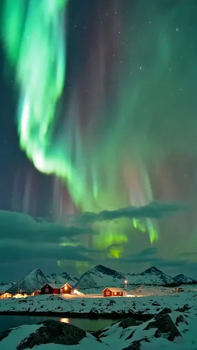 @Image 1, 15s smooth video, 8K ultimate high definition, 9:16 ratio, 6 shots with smooth and advanced transitions, cinematic camera sense + image quality, master-level camera movement, National Geographic-level scenery, ultra-high definition realistic real-person style, full real-shot texture without AI distortion, every frame is a screenshot of a cinematic aurora blockbuster; Character Setting: Eastern girl, slim and upright figure, cool and gentle temperament, clear eyes gazing at the aurora curtain, with a quiet and relaxed warm smile, clean, lively, and healing; long hair gently brushed by the night wind, a few strands sticking to the porcelain-white cheeks, extremely light makeup with soft brows and eyes, youthful and clean, possessing both boyishness and girlishness; wearing light-colored simple outfit, clothes fluttering in the wind, natural and realistic dynamics, perfectly blending with the artistic conception of the snowfield and aurora; Scene Screen: real natural night scene in the Norwegian Arctic Circle, dark blue gradient to dark green night sky, dynamic real aurora (green flowing and dancing like a sky curtain of silk, purple strands interwoven), sky full of bright stars, Milky Way clearly traversing the sky; towering continuous snow mountains in the distance, snow peaks glowing with holy cold light, frozen sea surface quiet as a mirror, dots of warm yellow light from small wooden houses on the shore; vast and quiet world, pure cloudless night sky, stars dense as diamonds, showing the vastness and dreaminess of the universe, cold and shocking; Light and Shadow and Texture: intertwining of cold aurora light and warm cabin light, soft and dreamy light, realistic and delicate details of snow mountains, aurora, snowfields, and characters, rich layers of light and shadow; majestic, quiet, and dreamy picture, carrying the cold sacredness of the Arctic Circle and the vast romance of the aurora.