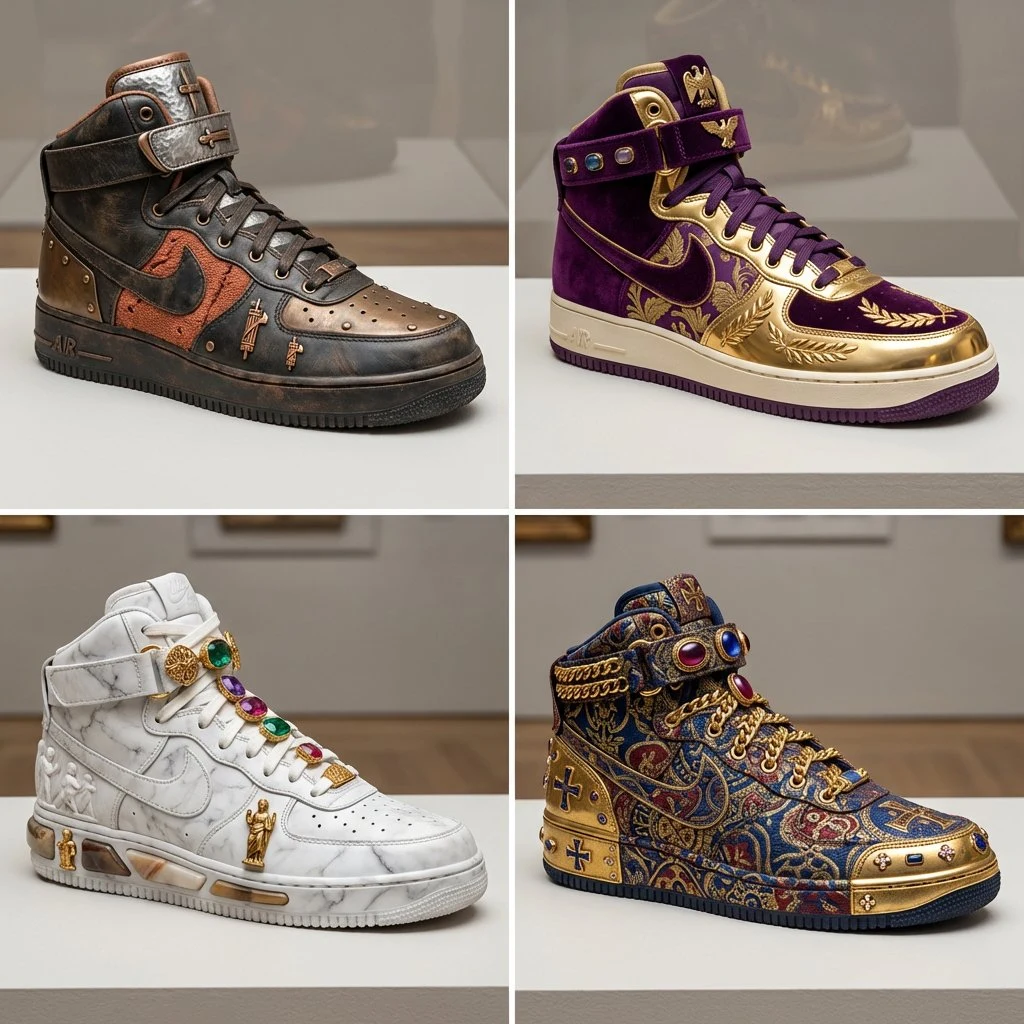 {"input": "古代帝国(如罗马、奥斯曼、阿兹特克、明朝)", "pick 4 specific distinct eras or ruler periods within that empire": "在帝国内挑选 4 个具体且互不相同的时期或统治者时代", "function drawx($era)": "函数 drawx($era)", "Anchor 1": "\"$era 的武器与盔甲\"(其质感、材质与颜色)", "Anchor 2": "\"$era 的宗教器物\"(其质感、材质与颜色)", "Anchor 3": "\"$era 的皇家珠宝\"(其质感、材质与颜色)", "Instruction": "渲染一双高帮运动鞋设计,恰好位于该三角形正中心", "output": "2x2 网格,为每个时期执行 drawx()"}