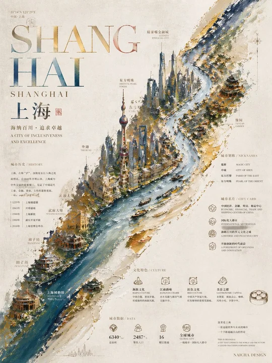 创作一张具有收藏价值、设计师海报气质与作者性审美的高完成度视觉作品。 整体风格为:油画风格 + 大师级排版文字设计。 画面需具有明显的厚涂技法质感,通过厚薄差异塑造立体感、材料感、节奏感与视觉层次,既有绘画肌理,又有现代设计感与展览级海报气质。 一、核心构图逻辑 采用居中偏斜的对角线主构图。 整张海报的核心视觉主体,不是缩在中间的一小团,而是由一条沿对角线方向大幅展开的不规则综合色带 / 图示承载区构成。 这条综合色带必须从画面一个对角方向自然延伸至另一个对角方向,形成近似贯穿全版的斜向视觉骨架,具备足够的长度、面积、张力与版面统摄力。 它必须舒展、大气、完整,不可局促,不可收缩成中间一坨,不可导致版面显得逼仄、狭窄、拘谨。 这条综合色带既像厚涂油彩横扫而成的一道主笔触,又像被提炼后的主题地貌、信息地带、文化切片或视觉载体。 综合色带的配色不能写死,必须根据用户最后输入的【城市 / 主题 / 对象 / 灵感】自动判断。 可以从该主题最典型的印象色、文化色、环境色、建筑色、情绪色中提炼出 2-3 种主色,形成高级且有层次的综合色关系。 例如可以呈现类似“紫金蓝”“赭红青”“墨绿金”“灰粉褐”等综合色逻辑,但具体色彩必须智能适配输入内容本身,而不是固定模板。 二、主体内容生成逻辑 在这条沿对角线展开的综合色带之上,承载与用户输入强相关的核心视觉内容。 如果输入的是城市: 自动提炼该城市最具辨识度的地标、建筑、名胜、水系、人文空间、历史象征、城市记忆、代表性文化元素等。 如果输入的是对象、主题或灵感: 自动提炼最有代表性的核心元素、关键场景、象征物、结构信息、文化线索、概念意象或视觉母题。 这些内容不要做成写实堆砌,不要像旅游宣传页素材拼贴,不要杂乱罗列。 必须以“极简俯视图 / 高度概括的图形化俯瞰景观 / 设计化地图感构成 / 信息化景观”的方式进行整合。 让它们像被压缩、提炼、嵌入在这条对角线综合色带之中,形成统一、克制、连续、有秩序的主图示系统。 图示区域内部必须具有连续性、流动性与整体性,让不同元素沿对角线方向自然展开、串联、过渡、呼应,形成类似视觉长卷般的观感。 不要中间挤、两头空,不要让主体断裂,不要把视觉重点缩在局部。 三、背景与留白 背景统一为米白色、暖白色或带轻微旧纸质感的纹理纸质背景。 纸面要有自然纸张纤维感、细腻颗粒感、轻微手工纸或高档印刷纸肌理。 整体背景必须干净、克制、安静,不要过度装饰,不要复杂花纹干扰主体。 必须保留大面积留白,但这种留白不是空洞无力,而是服务于对角线主结构的高级留白。 留白应让主体更突出,也让文字排版拥有足够的呼吸感、空间感、展览感与版式张力。 四、文字系统与版式逻辑 文字系统必须是整张海报的重要组成部分,而不是后贴上的说明文字。 整体文字原则上采用衬线体系统,体现高级、克制、经典、文化感、设计感兼具的大师级排版效果。 标题、主文案、副文案、知识点信息、小标注、注释性小字之间必须有清晰层级,并通过字号、疏密、错落、对齐、留白、聚散、呼应来形成真正的版式节奏。 必须明确版式优先级: 沿对角线大幅展开的综合色带 / 图示主体,是整张海报的第一视觉骨架与主叙事通道,优先级高于普通文字排版。 这条对角线主体必须保持连续、完整、舒展、不断裂。 所有大标题、拼音 / 英文大字、知识点模块、装饰文案、说明性文字,都必须服从这条对角线主体的完整性。 不得从中间横向切断主体,不得把主体拦腰打断,不得在主体最关键的连续区形成明显遮挡或割裂。 必须为对角线主体预留一条完整、清晰、连续的视觉通道。 文字系统应主要分布在主体两侧的留白区、四角留白区、边缘排版区,或沿主体边缘顺势排布,而不是粗暴压在主体中段中心。 若主体内部确实需要少量文字,只能是极少量、低干扰、嵌入式的小标注,例如局部名称、地标注释、小型标签等,并且必须顺应主体内部结构自然嵌入,不可形成大面积横截式排版。 五、拼音 / 英文大字的材质与配色 海报中必须加入一个“拼音 / 英文大字标题”,作为核心视觉文字之一。 如果用户输入的是中文城市、中文主题或中文对象,则自动提炼其拼音作为大字标题; 如果输入内容更适合英文表达,也可自动生成对应英文大字标题。 这个大字标题必须具有明显的烫印质感、金属材质感、箔印感或压印感,呈现高级、细腻、克制、具有印刷工艺美感的材质效果。 它可以带有轻微反光、压痕感、浮雕感、箔面质感、纸面烫印质感,但不能俗气,不能廉价,不能过度炫光,不能显得商业化过强。 这个材质大字的颜色方案不能被锁死为单一纯金色。 它必须根据用户输入的【城市 / 主题 / 对象 / 灵感】自动判断,灵活选择更适合的材质色彩方案,以避免画面在这部分显得死板、僵硬、单调。 可采用以下两种灵活方案之一: 方案一:统一单色 选择一种最能代表该城市 / 主题气质的材质色。 这个颜色可以是金、古金、铜金、香槟金、玫瑰金、银、铂金、墨金等金属色; 也可以是带有金属材质感的其他颜色,例如金属蓝、金属绿、金属紫、金属红、灰银蓝、青铜绿、暖棕金、墨黑金属感等。 重点不是“必须金色”,而是“具