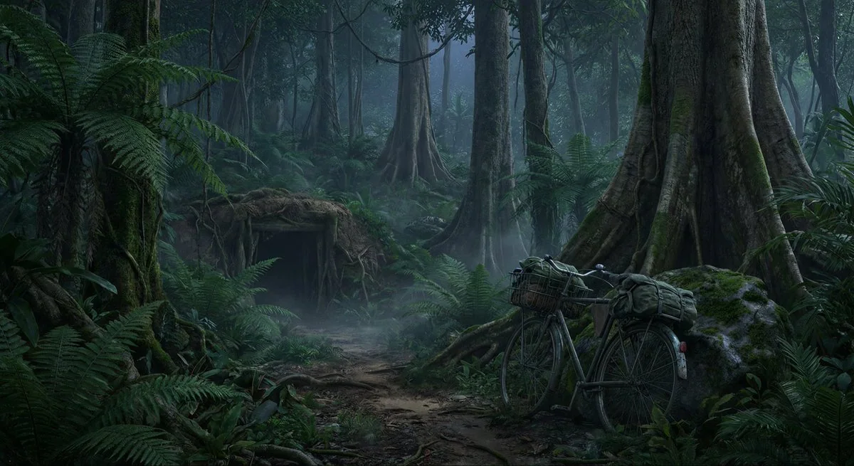 A hyper-realistic 3D view of a section of the Ho Chi Minh Trail deep within the Truong Son mountains at twilight. The dense triple-canopy jungle filters the fading light into a gloom of deep greens and indigos. A narrow, beaten dirt track winds through giant fern fronds and ancient teak trees. In the foreground, a heavily laden, reinforced bicycle leans against a mossy rock, half-hidden by foliage. A concealed tunnel entrance is barely visible beneath a tangle of roots. The atmosphere is heavy with humidity, mist rising from the forest floor, capturing the silent, hidden endurance of the logistical network. 黄昏时分,胡志明小道(Ho Chi Minh Trail)位于长山山脉(Truong Son mountains)深处的一段,呈现出超逼真的 3D 视图。茂密的三层树冠丛林将渐逝的光线过滤成一片深绿色和靛蓝色的幽暗。一条狭窄、崎岖的泥土小径蜿蜒穿过巨大的蕨类植物叶片和古老的柚木。前景中,一辆满载加固的自行车靠在一块长满苔藓的岩石旁,半隐于枝叶之中。一个隐蔽的隧道入口在盘根错节的树根下几乎看不见。空气中弥漫着湿气,薄雾从森林地面升起,捕捉到了这个后勤网络无声、隐秘的坚韧。