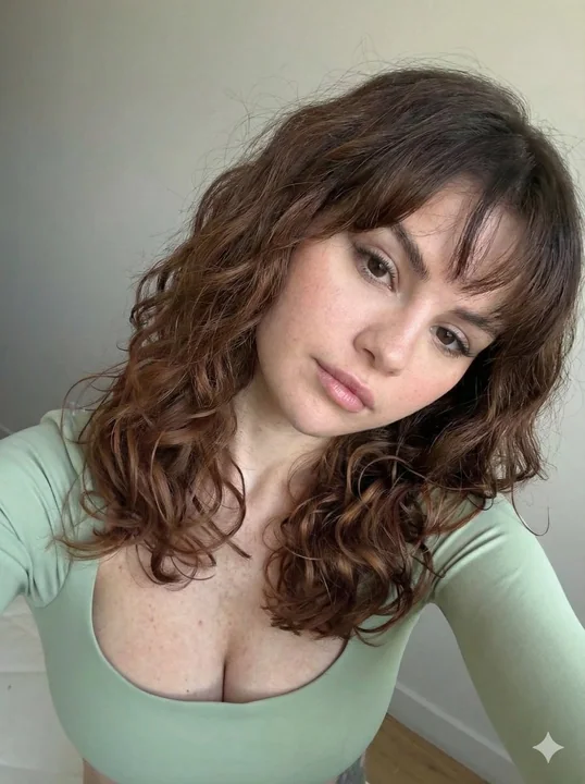 { "prompt_type": "Ultra Photorealistic Portrait", "subject": { "demographics": "Young woman, roughly 20s", "hair": { "color": "Vibrant auburn / ginger red", "texture": "Messy, voluminous natural curls and waves", "style": "Shoulder-length with wispy, face-framing curtain bangs", "detail": "Individual strands visible, frizz texture caught in light" }, "face": { "skin": "Fair complexion, highly detailed texture with visible natural freckles scattered across nose and cheeks", "eyes": "Soft brown, gazing directly into lens", "lips": "Full, plump, glossy light pink lips", "expression": "Neutral, soft, slightly alluring, relaxed pout" } }, "apparel": { "garment": "Long-sleeve fitted top", "color": "Pastel sage green / matcha green", "neckline": "Deep U-shape or scoop neckline", "material": "Smooth, stretch fabric (likely activewear or cotton blend)", "fit": "Tight, form-fitting" }, "pose": { "angle": "Selfie perspective, slightly high angle looking down", "position": "Head tilted to the right, shoulder slightly raised", "framing": "Upper body / bust shot", "composition": "Intimate close-up, centered subject" }, "lighting": { "source": "Natural diffused window light", "direction": "Front-facing", "quality": "Soft and flattering, creating gentle highlights on the forehead, nose, and lips", "shadows": "Minimal soft shadows under the jawline and hair" }, "environment": { "background": "Plain, minimalist interior wall", "color": "Off-white / light grey", "context": "Indoors, simple bedroom or living space", "clutter": "None, clean background focus" }, "mood_and_atmosphere": { "vibe": "Candid, effortless, intimate, natural beauty", "tone": "Warm, soft, authentic" }, "technical_camera_details": { "style": "Raw photography, smartphone selfie aesthetic", "resolution": "8K, highly detailed", "lens": "24mm wide angle (simulating phone camera)", "aperture": "f/2.8 for slight depth of field blurring the background", "film_stock": "Kodak Portra 400 simulation for warm skin tones", "rendering": "Unreal Engine 5, Octane Render, ray tracing", "texture_quality": "Ultra-realistic skin pores, hair strands, and fabric weave" } }