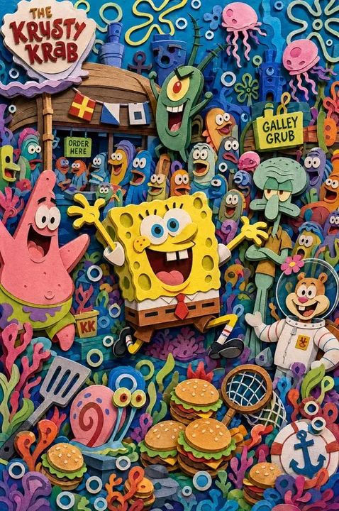 "layer_2": "The single most iconic protagonist character from [CARTOON_SHOW_NAME] as the central figure — frozen mid-signature-action, built entirely from stacked paper geometry",