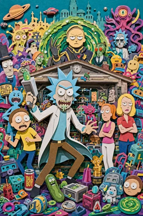 "layer_6": "Secondary characters and crowd figures from [CARTOON_SHOW_NAME] as flat die-cut paper silhouettes threading between architectural layers",