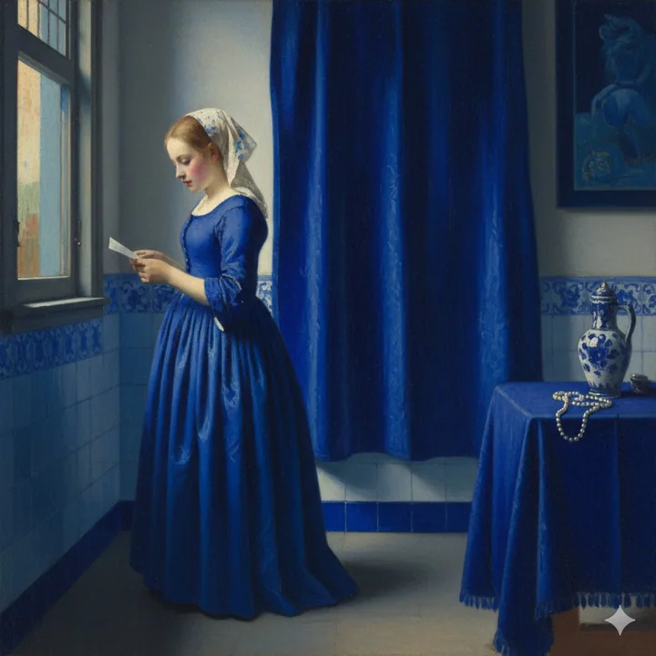 أنشئ وابحث عن صورة بأسلوب فيرمير باستخدام كميات وافرة من أزرق فيرمير (اللازورد، الأزرق الفاتح)!