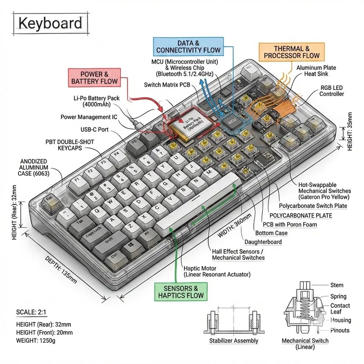 Create a technical infographic of [OBJECT NAME] with a 45-degree isometric 3D perspective showing the device slightly tilted to reveal depth and dimension. Combine a realistic photoreal render with black ink technical annotations on a pure white background. Include: Key component labels with color-coded callout boxes, internal component visibility through transparent/cutaway sections, measurements, dimensions, and precise scale markers, material callouts and quantities, color-coded arrows for function/flow: RED (power/battery), BLUE (data/connectivity), ORANGE (thermal/processor), GREEN (sensors/haptics), simple schematics or cross-sectional diagrams where relevant. Place “OBJECT NAME” title in a hand-drawn technical box (top-left corner). Style: Black linework (technical pen/architectural), sketched but precise. Object remains clearly visible. Educational museum-exhibit vibe. Clean composition, balanced negative space. Perspective: Isometric 3D angle—tilted to show depth, dimension, and internal architecture dramatically. Like a professional product teardown or engineering manual. Colors: ~10–15% accent density. Black dominant. White background. Output: 1080×1080, ultra-crisp, social-feed optimized.