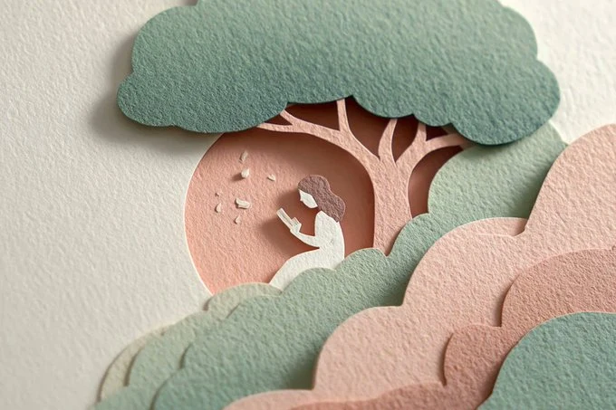 رسم توضيحي مقطوع من الورق المطبق للموضوع، مصنوع من أشكال متداخلة بلون ناعم [اللون1] و[اللون2]، نصوص يدوية، ظلال خفيفة بين الطبقات، حواف نظيفة متجهات، متمركزًا على خلفية كريمية ماتية، قصة بصرية غريبة ومتطورة.