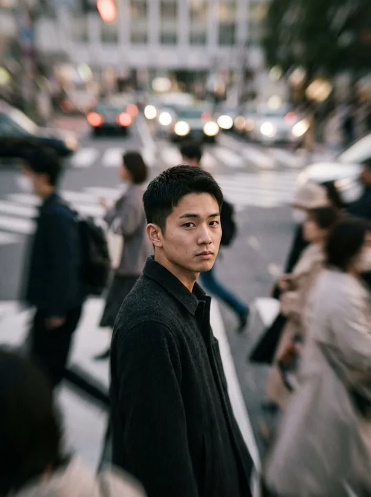 一位年轻的日本女性站在熙熙攘攘的人群中央,呈现出电影般的画面。她神情专注,散发出严肃而平静的气息,脸部轮廓清晰,而周围的人群则快速移动。主体周围应用了强烈的径向运动模糊,呈现出动态的运动效果和浅景深。自然柔和的阳光,柔和的色彩,柔和的米色和灰色调。居中构图,概念化了情感上的孤立,85mm 镜头,f/1.8 光圈,超细节皮肤纹理,写实摄影,高动态范围,8K 分辨率。