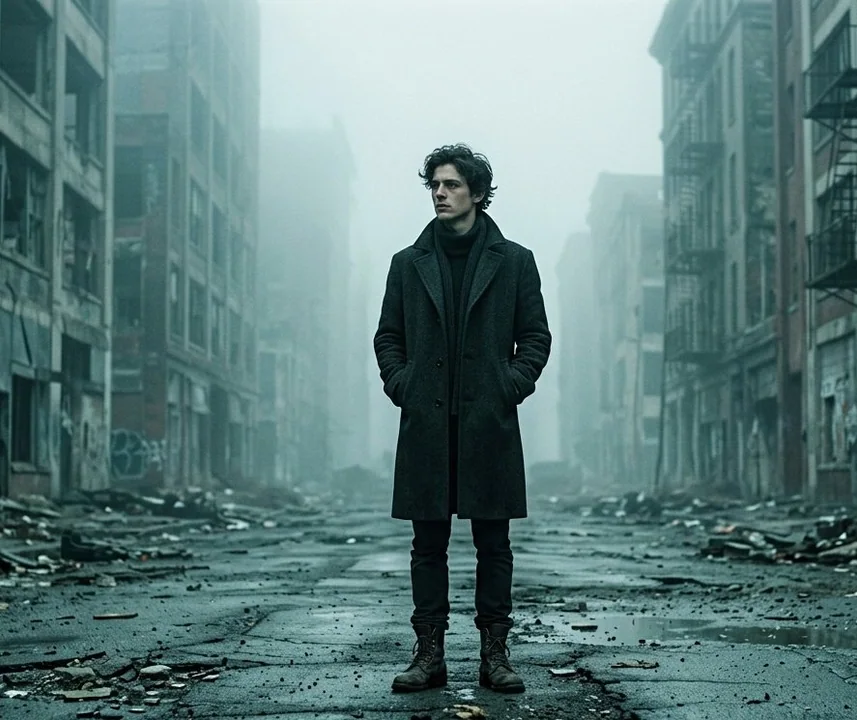 تقطيع فيلم كامل الجسم لصورة都会ية، امرأة شابة رقيقة تقف وحيدة في وسط شارع مدمّر فارغ في المدينة، تعبير جاد بعيد، شعر مموج فوضوي، ترتدي معطفًا طويلًا داكنًا وشالًا/عنقًا مرتفعًا، يضع يديه في جيبيه، جو بارد مزاجي، ضباب كثيف وضباب، لوحة ألوان غير مشبعة من اللون الأخضر الزمردي/الرمادي الأخضر، مباني عالية على جانبيها تخلق ممرًا.