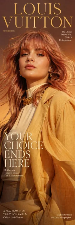 Ultra high-fashion magazine cover, Louis Vuitton-style editorial. Close-up portrait of a confident woman with soft rose-gold hair and natural airy bangs, slightly wind-blown for movement. She is wearing a luxury summer outfit: a structured lightweight linen or silk jacket in warm golden-yellow tones, layered over a modest high-neck top, paired with a bold gold choker necklace and subtle statement earrings. Fabric flows naturally with a summer breeze, slightly textured and breathable, capturing a premium seasonal feel. Styling is elegant, modest, and refined — no revealing clothing. Lighting is high-end studio mixed with natural golden hour glow: warm highlights, soft shadows, luminous skin with glossy editorial finish. Background is a rich summer gradient (sunset gold fading into soft coral or warm beige), clean but visually striking. Composition is dynamic and slightly cinematic: hair in motion, shallow depth of field, sharp focus on face. Typography: large elegant serif masthead “Louis Vuitton” at the top, bold cover line “YOUR CHOICE ENDS HERE” in premium editorial layout, minimal supporting text. Ultra-realistic, hyper-detailed skin texture, 8K resolution, sharp focus, glossy magazine print quality, cinematic color grading, luxury fashion photography, no nudity, tasteful and editorial.