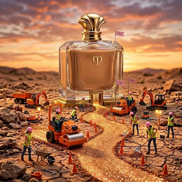 超精细微缩建筑场景,风格为奢侈品广告。一个巨大的奢华粉底液瓶像摩天大楼一样矗立在金色时段的龟裂沙漠景观中。戴着粉色安全帽和霓虹色安全背心的小型女性建筑工人操作着小型橙色压路机,铺展闪亮的古铜色粉末,打造一条发光的路径。一些工人推着装满闪亮化妆颜料的独轮车,另一些则铲土平整地面。施工现场周围放置着交通锥。温暖的日落光线,微距摄影,浅景深,逼真的纹理,柔和的阴影,编辑美容广告风格,85 毫米镜头效果,高动态范围,电影级构图,超现实细节,1:1 宽高比。