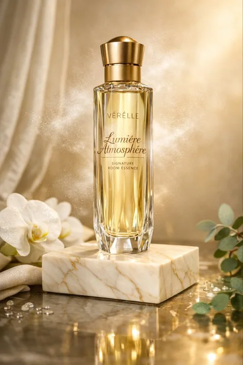 { "master_prompt": { "scene_type": "ultra-realistic luxury home fragrance commercial photography", "product": { "type": "luxury room freshener spray", "brand_name": "VÉRÉLLE", "product_name": "Lumière Atmosphère, Signature Room Essence", "container_shape": "slender architectural glass atomizer with elongated silhouette", "material": "crystal-clear faceted glass", "finish": "prismatic transparency with refined light refraction", "cap_design": "brushed champagne-gold magnetic cap with sculpted top", "label_design": { "style": "Parisian luxury serif typography", "primary_text": "Lumière Atmosphère", "secondary_text": "Signature Room Essence", "finish": "champagne foil emboss with micro-engraved detailing" }, "liquid_color": "soft golden champagne tone with luminous clarity" }, "composition": { "placement": "center hero placement", "pedestal": "ivory marble pedestal with subtle gold veining", "base_surface": "polished stone reflective surface", "surrounding_elements": [ "white orchid blossoms", "linen fabric folds", "glass dew droplets", "soft eucalyptus sprigs" ], "atmospheric_effect": "delicate fragrance mist diffusing elegantly around the bottle" }, "lighting": { "style": "high-end interior luxury lighting", "key_light": "soft diffused glow for glass clarity", "rim_light": "warm highlights defining bottle edges", "fill_light": "gentle ambient fill for soft shadows", "reflections": "controlled specular highlights for premium finish" }, "background": { "color": "warm ivory to champagne gradient", "style": "luxury interior editorial backdrop", "depth": "cinematic shallow depth with soft falloff" }, "camera": { "angle": "slightly low hero angle", "focus": "typography and crystal texture", "depth_of_field": "cinematic shallow depth", "resolution": "8K ultra-detailed clarity" }, "mood_keywords": [ "refined living", "luxury home ambiance", "clean elegance", "premium interior lifestyle", "serene atmosphere", "timeless sophistication" ] } }
