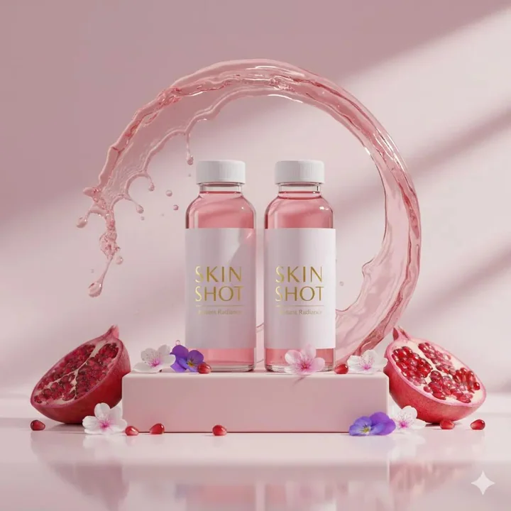 Photographie commerciale ultra-réaliste d'une bouteille de boisson au collagène pour la beauté portant l'étiquette "Skin Shot - Instant Radiance" sur un piédestal rose doux, entourée de fleurs comestibles et de moitiés de grenade, avec un arc de gouttelettes derrière la bouteille, lumière d'étude diffusée avec des reflets de contours, base réfléchissante et glossy, profondeur cinématographique, composition minimaliste de luxe, typographie nette en mise au point, campagne haut de gamme en 8K.
