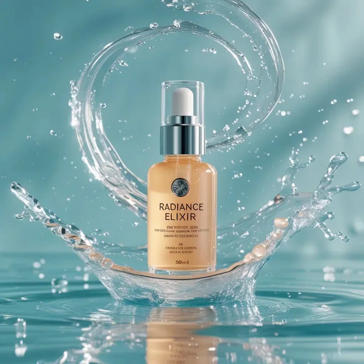 Luxury skincare commercial, ultra-premium aesthetic. Use the provided product image as the exact reference for bottle shape, label design, liquid tone, reflections, and overall styling. The bottle stands perfectly upright at the center of the frame, surrounded by a glossy liquid surface with smooth, elegant ripples. Soft fluid splashes form a graceful crown around the base, catching light like crystal. Background is a dreamy pastel aqua-to-soft lavender gradient with a silky, creamy atmosphere and subtle mist particles floating in the air. Camera motion: Slow, continuous 360-degree cinematic orbit around the product. Movement is smooth, controlled, and hypnotic. Constant speed throughout. No shaking, no zooming, no speed changes. The product remains perfectly centered and stable at all times. Framing: Mid close-up beauty shot. Bottle remains vertical and motionless, hero focus. Lighting: High-end studio lighting, soft diffused glow with gentle highlights and glossy reflections. Subtle rim light to outline the bottle. Liquid and glass look luminous, hydrated, and silky. Mood & style: Sensual, elegant, and premium beauty campaign. Smooth motion, glossy textures, soft reflections, cinematic depth of field, slow-motion feel, luxury skincare advertisement, 4K photorealistic, polished commercial look.