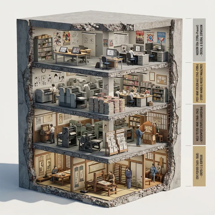 Evolution of Manga --> A single chunky block (like a museum cutaway) sliced to reveal 4 stacked floors/strata. Each level represents an era/stage/version inferred from INPUT. Right side: a vertical legend bar with dates/period labels inferred by the model. Infer 4 major phases and depict each with representative artifacts, tools, and environments. Keep transitions educational: show what changed between levels (materials, scale, method). Architectural section realism: visible thickness, rebar/fasteners if applicable, realistic debris at cut edge.