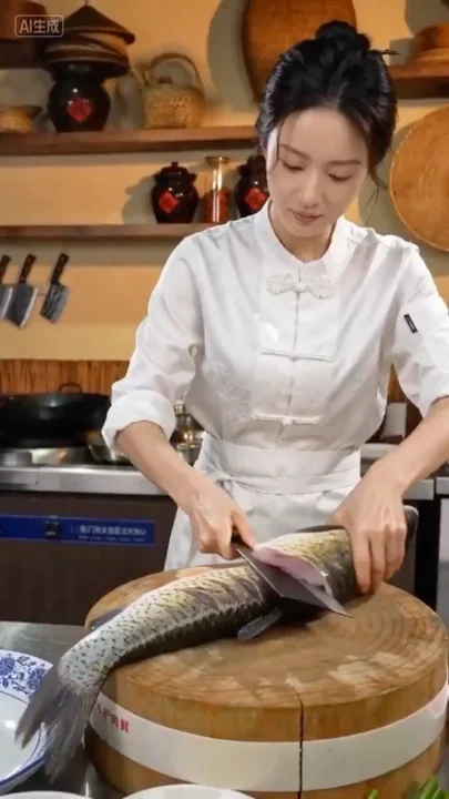 动作主体@【@图1】身穿白色厨师装 0-2秒(起刀宰鱼):俯身按鱼,布鞋踏稳灶台,快刀斜劈鱼头,刀刃沿脊骨一划,两爿鱼肉应声分离,鱼排被指风弹飞落盘。 2-4秒(片鱼成薄片):鱼肉平摊案上,手腕翻转,刀光如织,薄如蝉翼的鱼片连刀不断,飘落时带起微风,掌风裹着调料快速翻拌,鱼片裹浆均匀,盈润光泽。 7-9秒(炒料爆香):铁锅上火,油热时脚尖勾来酸菜坛,酸菜、泡椒被掌风扫入锅中,翻炒间酸辣气冲天,褂摆被热气掀得轻晃。 9-12秒(煮鱼勾芡):高汤入锅沸腾,抖腕撒入鱼片,掌风控温不让鱼肉散碎,勾薄芡时旋锅画弧,汤汁浓稠裹住每片鱼。 10-12秒(泼油收招):热油淋在蒜末、干辣椒上“滋啦”作响,收势时褂角垂落,酸菜黄亮、鱼片雪白,热气中飘着醇厚的酸辣香,然后镜头定格在这盘沸腾的酸辣鱼上。(画面中不要出现文字信息)