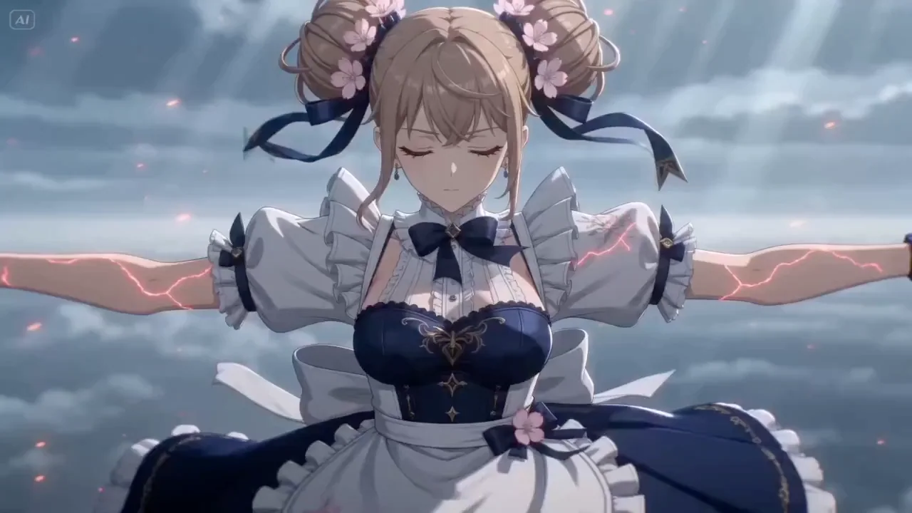 00-02s: "Vertical free-fall. The character descends through the clouds with eyes closed, hair and ribbons whipped violently by the wind. Red electrical arcs dance across her skin as dark mecha plates begin to converge from the periphery, falling in sync with her body."