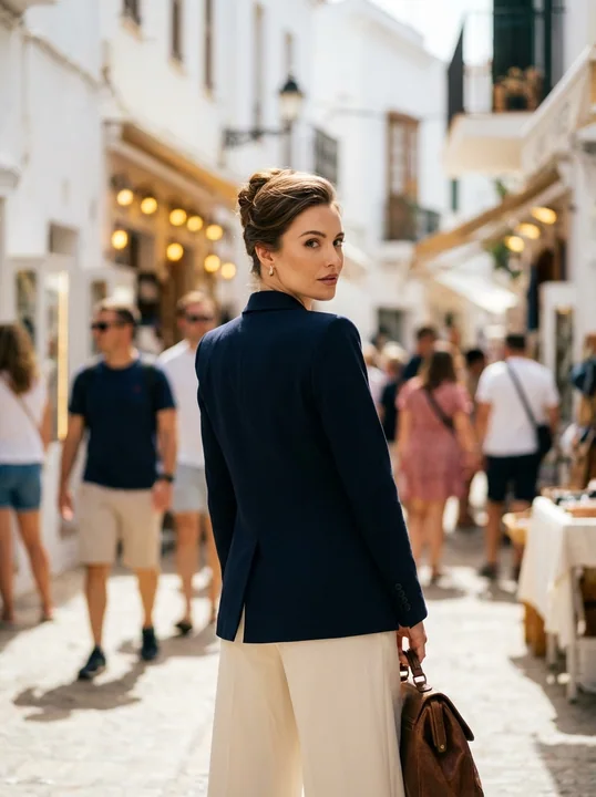 تُصوير شارعي أنيق لسيدة ترتدي جاكيتًا بنيًا داكنًا بتصميم دقيق مع كتفين حادين وسروالًا أبيض فاتحًا بساقين واسعتين، وهي تنظر إلى الوراء من كتفها. تقف على شارع مشرق مغطى بالدهان الأبيض في سوق متوسطي قديم، مع مشاة متناثرين في الخلفية وأضواء متاجر دافئة. التصوير تم باستخدام كاميرا Hasselblad X2D مع عدسة 80 مم. الأسلوب سينمائي وواضح مع عمق مجال ضحل. جمالية "النقود القديمة"، أسلوب راقٍ ومُحسَّن.