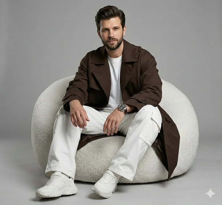 Hyper-realistic cinematic fashion photoshoot of a young man. He has a refined slim face with a lean, youthful, and elegant physique. Seated casually on a deep white bean bag, he wears bold all-dark chocolate oversized streetwear: a stylish trench coat over a clean white inner t-shirt, wide white pants, chunky sneakers, and a silver watch. The background is minimal with an aesthetic grey tone.
