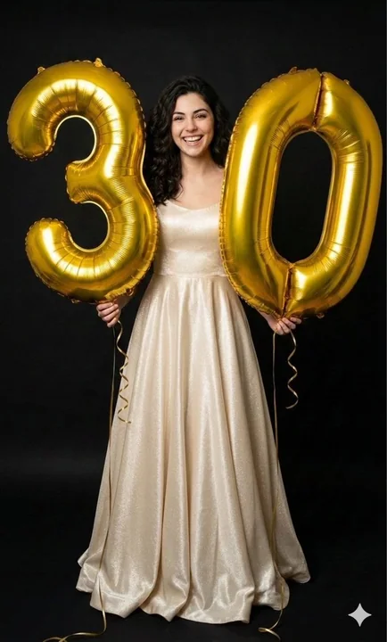 A photorealistic, highly detailed 4K studio portrait of a smiling young woman [Use the uploaded image as reference] holding large metallic gold foil [Age] balloons. She wears a creamy shimmery satin gown, standing against a solid black background. The color palette emphasizes bold black, shiny gold, and light denim blue. Soft, direct studio lighting highlights the glossy balloon textures and trailing gold ribbons. The full-body, centered composition captures a cheerful, celebratory birthday atmosphere.