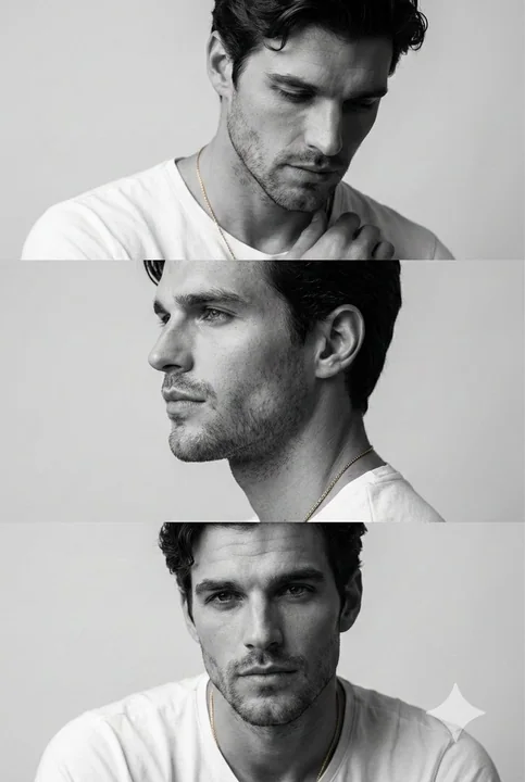 保留模型面部、比例和外部特征与参考图一致。极简主义的单色时尚专题三联画,由三个堆叠的电影风格画幅组成。主体是一位留着深色短发、修剪整齐胡须的年轻男子。画幅 1:情感丰富且内省,低头,一只手靠近锁骨,伦勃朗光线突出骨骼结构。画幅 2:清晰的侧面特写,聚焦于鼻子、嘴唇和阳刚的下颌线,目光略微向上。画幅 3:正面、沉思的肖像,肩膀放松,目光直接接触。构图简洁现代,使用白色 T 恤和金色项链保持视觉连贯性。商业杂志品质,高端无反相机拍摄,真实的皮肤毛孔,柔和的焦外虚化,以及优雅的阳刚之气。