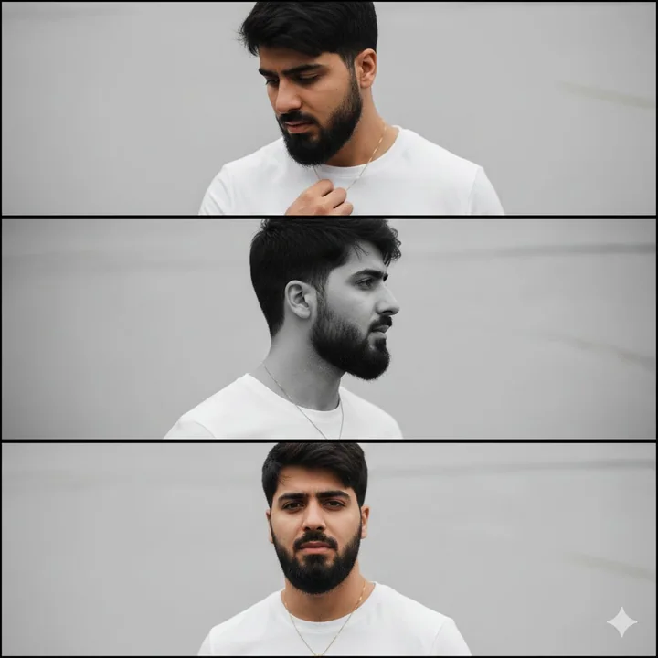 Préserver le visage, les proportions et les caractéristiques externes du modèle comme dans la référence. Un triptyque de mode monochrome minimaliste présentant trois cadres cinématographiques empilés. Le sujet est un jeune homme aux cheveux courts et sombres, vêtu d'une