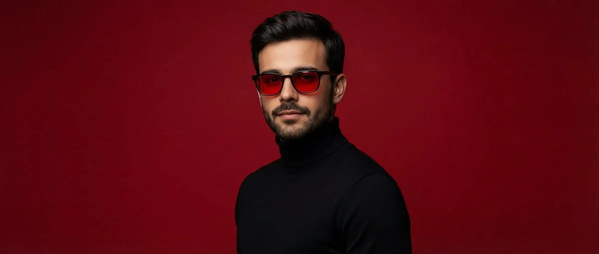 A confident man standing against a deep red studio background, wearing a fitted black turtleneck and red-tinted rectangular sunglasses. He faces slightly to the side with a calm, composed expression. Minimalist fashion aesthetic, sharp jawline, clean haircut, modern tech-founder vibe. Soft but directional studio lighting creating gentle shadows on the face and body. High contrast between the black outfit and red backdrop. Cinematic, editorial portrait style. Ultra-realistic, shallow depth of field, crisp focus, premium fashion photography look. 一位自信的男士,身着修身黑色高领毛衣,戴着红色镜片的长方形墨镜,站在深红色影棚背景前。他略微侧身,表情平静而沉着。极简时尚美学,下颌线分明,发型整洁,散发着现代科技创始人的气息。柔和但有方向性的影棚灯光在他脸部和身体上投射出轻柔的阴影。黑色服装与红色背景形成强烈对比。电影感、杂志肖像风格。超现实主义,浅景深,清晰对焦,高端时尚摄影质感。