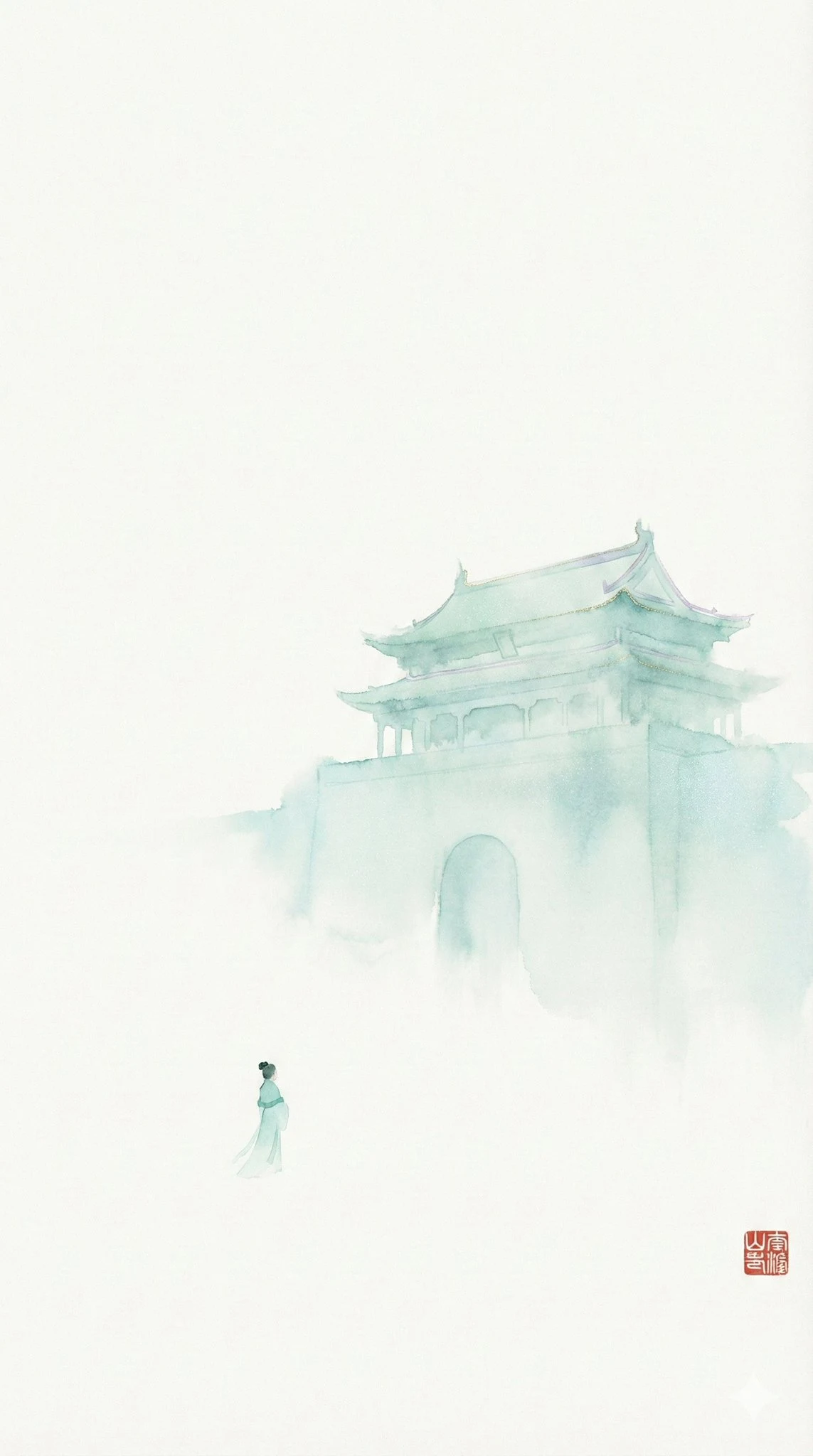 A minimalist wide-angle painting in the Song Dynasty style, adhering strictly to the "less is more" philosophy. The composition is dominated by vast expanses of pure, cold white Xuan paper representing infinite void. A group of multiple Song Dynasty women are depicted dancing, viewed from behind. Their figures and flowing robes are suggested ONLY by swirling, extremely faint, highly diluted, wet-on-wet washes of cold pale jade green and cyan ink that bleed softly into the absorbent paper texture, appearing like dancing clouds or flowing water rather than solid bodies. There are NO hard, dry outlines or solid color blocks. The ink wash possesses a subtle, microscopic crystalline shimmer, like ground mineral pigments catching ambient light. Extremely delicate, hair-thin metallic gold and soft lavender traceries define the dynamic, swirling edges of their long sleeves and ribbons in motion. Immense tranquility, graceful movement, ethereal elegance, cool temperature. **In the bottom right corner, there is a distinct, traditional square Chinese red cinnabar seal (chop). It is meant to be the four characters "只此青绿", carved in the specific highly stylized Song Dynasty "nine-fold seal script" (九叠篆) style, characterized by intricate, winding, folded strokes that geometrically fill the square space.** --ar 9:16 一幅极简广角宋代风格绘画,严格遵循“少即是多”理念。构图以大片纯冷白色宣纸表现无垠虚空。数名宋代女子背身起舞,仅由极淡、极度稀释、湿中湿晕染的冷青玉色与青绿墨色暗示身形与飘逸衣袂,墨色在吸水性纸纹中轻柔晕开,似舞云或流水而非实体。无硬干轮廓或色块。墨色具微妙微晶闪光,如研矿物颜料映环境光。极细发丝宽金属金与柔薰衣草紫线描舞袖与飘带动态边缘。极静、雅动、空灵逸致、冷温。**右下角一方传统中国朱红印,四字“只此青绿”,以典型高度风格化宋代“九叠篆”刻成,笔画繁复回环,几何填满方格。** --ar 9:16