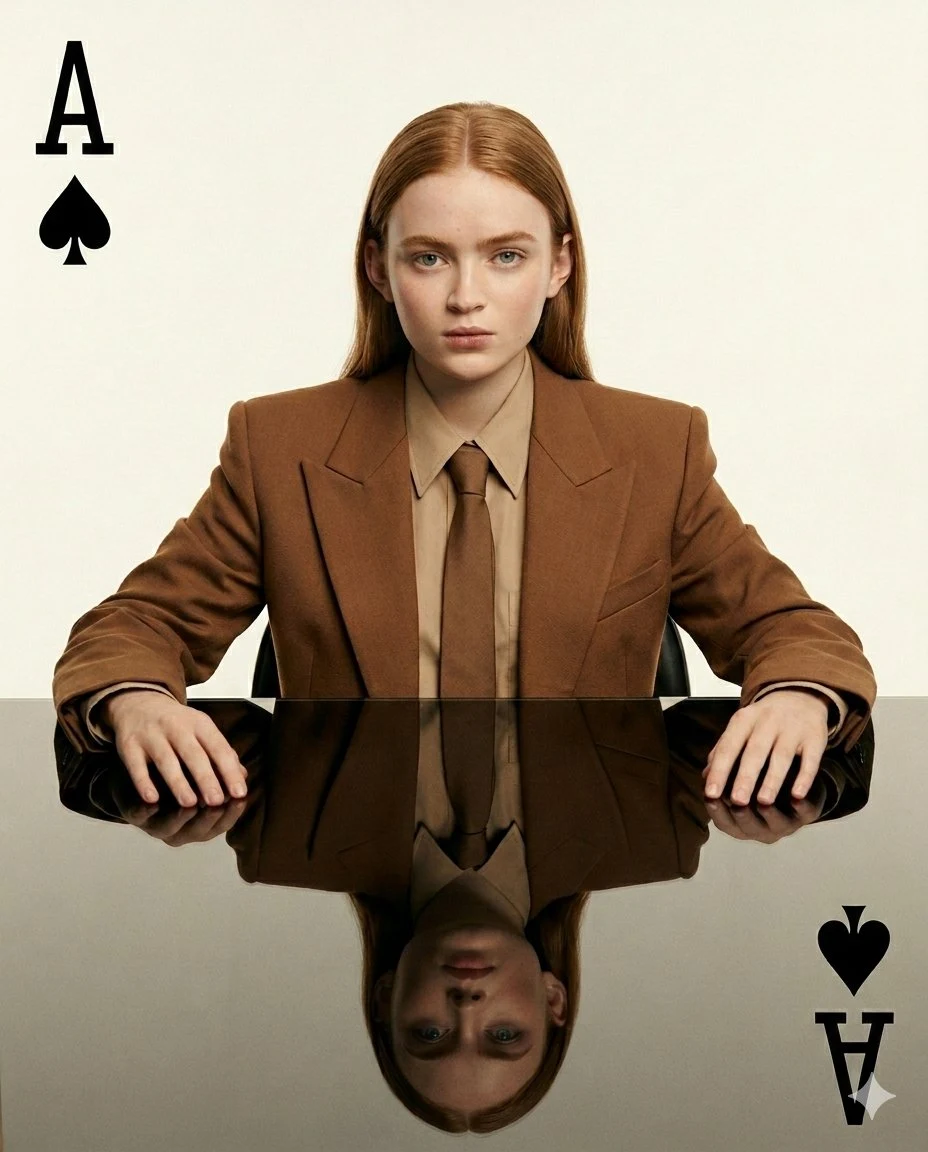 Transform this image [UPLOAD YOUR IMAGE] into a 64K DSLR-quality resolution ultra-hyperrealistic minimalist fashion editorial portrait of a young woman (same face as the uploaded image) seated at a glossy reflective table, styled as a conceptual playing card composition. Vertical 4:5 aspect ratio, symmetrical framing. Subject details: A young woman (same face as the uploaded image) with long, straight light-brown hair parted neatly in the center, one side tucked behind her shoulder. Clear porcelain skin, soft neutral makeup, natural brows, subtle peach-toned lips. Calm, serious facial expression with direct eye contact toward the camera, conveying confidence and quiet authority. Wardrobe styling: Tailored brown blazer with structured shoulders, paired with a beige button-up shirt and matching brown tie. Monochromatic earth-tone palette. Sharp, clean tailoring for a refined androgynous aesthetic. Pose & composition: She sits upright at a polished glass table, both hands placed symmetrically near the center edge. The glossy surface creates a near-perfect mirror reflection of her face and upper body, forming a dual-image effect resembling a playing card design. Graphic elements: Minimal off-white/cream background. Large black playing card symbols placed in opposite corners: Top left: "A" with spade symbol (Ace of Spades). Bottom right: mirrored "A" with spade symbol. Typography is bold, simple, serif style. Lighting: Soft, diffused studio lighting with even illumination across the face and blazer. Minimal shadows, subtle soft highlights on cheekbones and hair. Clean high-fashion editorial lighting style. Color grading: Warm vintage tones with slight film grain. Muted browns, beige, and cream hues. Soft contrast, matte finish, timeless aesthetic. Lens & quality: 85mm lens look, shallow but controlled depth of focus on subject and reflection. Ultra-detailed fabric textures, realistic skin detail, professional fashion magazine quality, 64K resolution. Mood & theme: Conceptual fashion editorial, power and poise, minimalist luxury, modern royalty symbolism. Playing card queen/ace aesthetic with a contemporary twist. Octane render, ultra-hyperrealistic & Unreal Engine 5. Sharp inverted aesthetic.