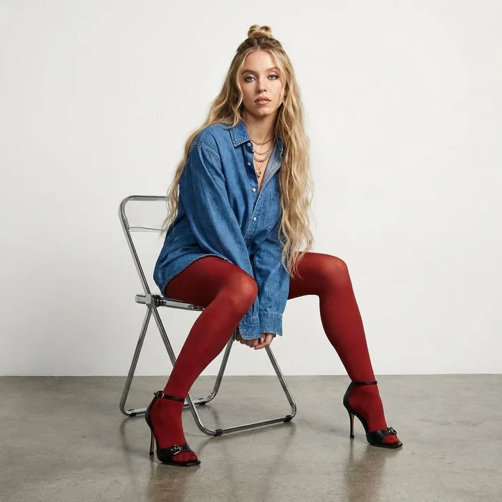 { "prompt_type": "full image generation", "output": { "image_count": 1, "variation": "none", "seed_behavior": "single deterministic result", "aspect_ratio": "2:3", "orientation": "portrait" }, "camera": { "angle": "low-to-mid frontal angle, slightly below eye level", "distance": "approximately 2 meters from the subject", "lens": "fashion portrait lens, mild compression, no distortion", "framing": "full body portrait from head to feet", "crop_rule": "no cropping of head, hair, legs, ankles, or feet" }, "subject": { "description": "A young Woman with a confident, high-fashion editorial presence", "pose": { "body_position": "seated on a simple metal folding chair", "torso": "leaning slightly forward from the hips", "arms": { "left_arm": "resting naturally on the left thigh", "right_arm": "bent, hand relaxed near the knee" }, "legs": { "position": "open seated stance", "orientation": "both legs angled forward toward the camera", "visibility": "knees, calves, ankles, and feet fully visible" }, "head": { "position": "upright", "gaze": "direct eye contact with the camera" } } }, "face": { "visibility": "fully visible", "expression": "calm, confident, editorial intensity", "makeup": { "eyes": "defined eyeliner with soft smoky eyeshadow", "lips": "muted rose lipstick", "skin": "smooth, softly contoured, studio-perfect" } }, "hair": { "color": "blonde", "length": "extreme ultra-long hair reaching the ankles", "absolute_reference": "hair flows from the scalp, passes the waist, hips, thighs, knees, calves, and reaches ankle level", "visibility_rule": "hair must be clearly visible draping over the thighs, crossing the knees, continuing past the calves, and ending at the ankles", "extra_margin": "a small portion of hair may lightly touch the top of the feet to guarantee ankle-level length", "style": "loose natural waves", "top_style": "half-up top knot bun", "density": "very high volume, thick strands", "priority": "hair length accuracy is mandatory and overrides all styling or composition conflicts" }, "outfit": { "upper_garment": { "type": "oversized denim shirt", "color": "medium blue denim", "fit": "loose and relaxed" }, "hosiery": { "type": "opaque tights", "color": "red", "opacity": "high", "texture": "smooth matte finish" }, "shoes": { "type": "black high-heeled sandals", "heel": "thin stiletto, approximately 10–11 cm", "ankle_strap": "visible buckle" }, "accessories": { "neck": "layered gold necklaces" } }, "environment": { "location": "minimalist photo studio", "background": "clean white seamless" } }