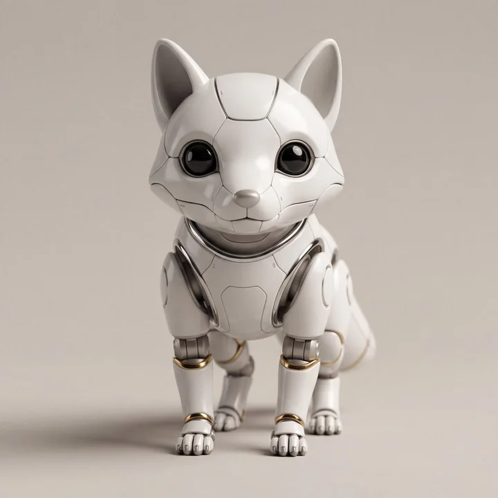 未来派の超現実的なロボットカエル、リアルなプロポーション、滑らかな白いセラミックのような装甲プレートで、見えるパネルの分割、丸みを帯びた機械的な関節、コンパクトでバランスの取れた身体構造。大きく輝く黒いカメラレンズの目、ミニマルな顔の特徴、部品の間の微妙な継ぎ目に、関節付きの指と足趾を持つ精密設計された四肢、柔らかなインダストリアルデザイン言語。温かみのあるライトグレーカラー、ミニマルでクリーンな構図、写真スタイルで、一部の被写体にクロームラインと輝くゴールドが組み合わさっている。上部と前面から柔らかな拡散光が当たっており、被写体の下にはやさしい影が落ちており、強いコントラストはなし。超詳細な表面仕上げ、マットとセミグロスの素材のバランス、中央構図、高リアルな表現、現代的なインダストリアルデザインの美学、柔らかなディープフォーカス、シャープなフォーカス、文字、ロゴ、ウォーターマークはなし。フラットな背景、アスペクト比9:16。ネガティブプロンプト:有機的な皮膚、ぬめりのあるテクスチャー、汚れ、傷、錆、風化した金属、カラフルなパレット、サイバーパンク、ネオンライト、カートゥーンイラスト、ローポリ、ファンタジーなスタイル、ドラマチックなシャドウ、乱雑な背景、被写体の下に箱がない。