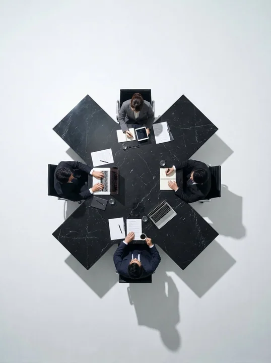 Une photographie ultra-réalistes, vue d'ensemble prise avec un objectif ultra grand-angle. Au centre de l'image se trouve une table de conférence sur mesure, soigneusement façonnée en forme de [X]. La table est en [marbre noir] et posée sur un sol [blanc clair], créant un grand espace négatif autour d'elle pour une composition propre et minimaliste. [6] employés japonais sont assis le long du bord de la table en forme de [X]. [Agencement : par exemple, 3 personnes de chaque côté]. Action : [Participent à une réunion d'affaires (par exemple, des poses comme travailler sur un ordinateur portable, boire du café)]. Éclairage et qualité de l'image : éclairage professionnel de studio avec des ombres nettes et distinctes qui mettent en valeur la silhouette [X] reflétée sur le sol. Résolution 8K, mise au point nette, esthétique commerciale cinématographique. Format 3:4.