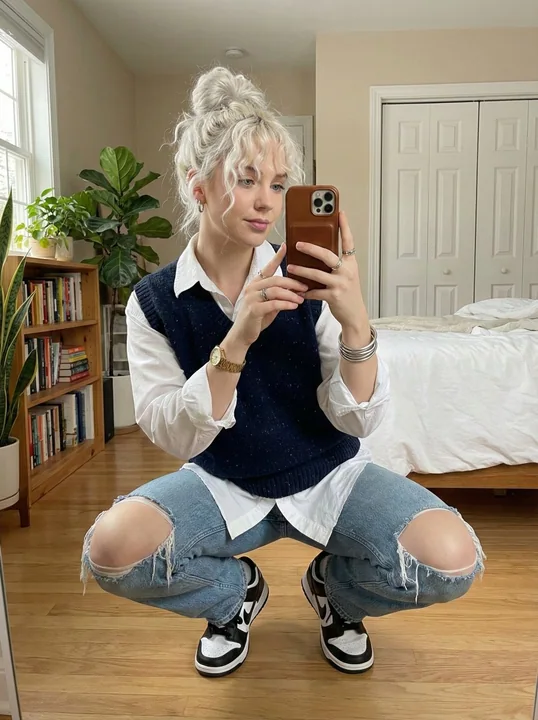 手持スマートフォンカメラの視点で、わずかな自然な震えがある。巻き毛で乱れたアップスタイルの若い女性が、鏡の前で膝をつき、白いシャツに黒いベストを着て、破れた青いジーンズをはいている。彼女はスマートフォンを鏡に向かって持ち上げ、ほんの少し笑っている。動画全体を通して、彼女の体、顔、ポーズは完全に静止している。突然、現実的で澄んだ水が四方から急速に部屋に流れ込み、水位が急速に上昇し、ベッド、本棚、植物を次第に覆っていく。水の動きは速く力強く、見える波紋、気泡、水しぶき、漂う粒子が見られる。光は水を通して屈折し、キラキラと輝く反射やゆがんだ鏡の映像を生み出している。水の屈折により環境がわずかにゆがんでいる。女性は反応しない。周囲の環境が激しく動いても彼女は静止し、冷静なままでいる。手持ちの撮影構図は一貫している。映画的リアリズム、高精度な水の物理表現、ドラマチックな照明、静止した被写体と混沌とした環境の間の超現実的なコントラスト。