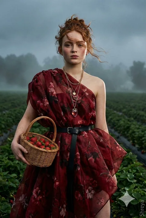 映画級のハイファッション収穫ポートレート。私は自分の顔を完全に変更せずに写されている。重要なこと:参照画像の顔の特徴を変更しないでください。出力画像は参照画像と100%同じ顔の特徴を持つ必要があります。私は中景に位置し、やや横に傾いた姿勢で、新鮮に収穫されたイチゴが入った織り物のアーティザンのバスケットを、股に軽く乗せている。私は広がる、非対称なダークレッドのフローラルシルクオーガンザのドレスに包まれており、エッジィな編集的なコントラストのために、粗く、傷ついたブラックレザーベルトでウエストが絞られている。首には層状の細いゴールドのネックレスが巻かれ、その上には目立つ重厚なクリスタルイチゴのペンダントが取り付けられている。髪は乱れ、ボリュームがあり、テクスチャーのあるアップドウにスタイリングされており、ゆるく風に揺れる髪のストリームが顔の輪郭を縁取っている。メイクはミニマルで完璧なマットな肌、シャープなマスカラ、そして柔らかく赤らんだ頬。シーンは、広大なイチゴ畑で行われており、ドラマチックでムーディーな曇天の下、厚い大気の霧がゆっくりと流れてくる。カメラの外から発せられるストロボの硬質なリムライティングが暗闇を切り裂き、私のシルエットとドレスの透過性のあるシルクを際立たせている。85mmレンズで撮影され、魅力的な圧縮効果と、微妙なノスタルジックなグラインが特徴的なスタイリッシュな35mmフィルムの美学を表現している。出力画像は参照画像と100%同じ顔の特徴を保つこと。顔を変更しないでください。-ar 2:3 画像の「右下隅」に、「Shreya」という明確に見えるウォーターマークが垂直に記されている。