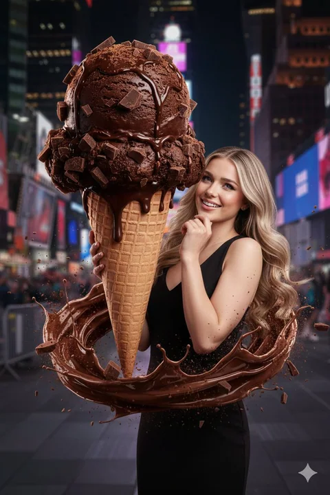 Hyperrealistic full-length promotional photo of a giant dark chocolate ice cream in a waffle cone, immersed in a swirl of glossy chocolate cream, top of the ice cream covered with oversized chocolate chunks, cocoa dust and shards scattering chaotically in a creamy storm, ice cream falling downward with glossy deep brown textures, background New York Times Square glowing in night neon lights, confident western woman in a stylish black evening dress standing slightly behind the falling ice cream, looking up with an excited smile, hair flowing in the motion, soft neon reflections on her face, holding the waffle cone elegantly like a luxury dessert advertisement, cinematic lighting, high-fashion commercial vibe, shot on Camera Sony A9 --ar 2:3 --stylize 300