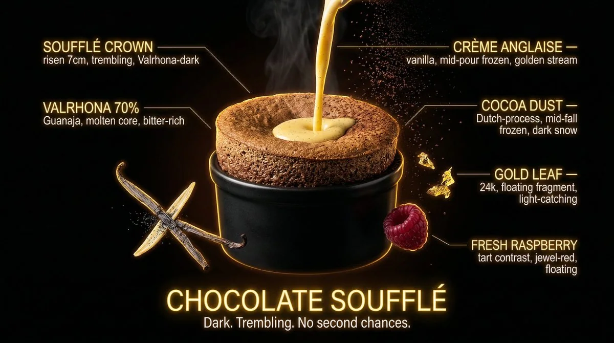 超写实风格的菜肴,以纯黑色为背景,搭配戏剧性的暖色调和电光色霓虹边缘照明。盛器居中,主要食材完全写实且令人垂涎欲滴,每种质地都闪闪发光,酱汁滴落和芝士拉丝在霓虹灯下如同液态玻璃般晶莹,蒸汽在彩色光线中氤氲发光。配料戏剧性地漂浮在周围,每一种都由霓虹光照亮。标签采用霓虹发光的紧凑大写字母,带有90度弯角:"[食材准备、质地、产地]",重复6次,每个标签呈现不同的霓虹色调。菜肴名称以粗体霓虹灯招牌字体显示在顶部:"[菜肴名称]"。副标题:"[标语]"。纯黑色背景,4K极致清晰,温暖的食物色调在黑暗中发光,令人垂涎。
