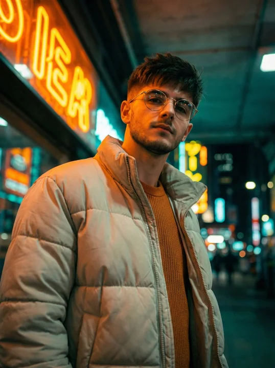 Ultra realistic cinematic fashion portrait of a young man with round glasses, looking down at the camera, low angle shot, wearing an oversized light puffer jacket and warm orange sweater, standing under bright orange and yellow neon lights in an urban tunnel, strong teal and orange color grading, intense contrast, vibrant glowing background, dramatic lighting on face and jacket, shallow depth of field, soft bokeh, 35mm lens, night city atmosphere.