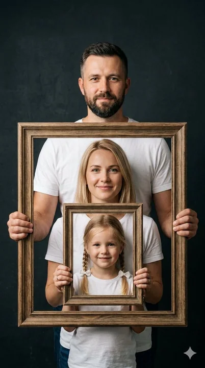 一张摄影棚肖像,采用对称的嵌套构图,背景为深炭灰色。一名留着短发、蓄着胡须的男子,身穿白色T恤,手持一个大型木制相框。相框内是一名身穿白色T恤的金发女子,她手持一个较小的木制相框。她的相框内是一名扎着辫子的金发小女孩,身穿白色T恤。图像采用柔和的摄影棚灯光,中性色调以白色和暖木色为主,细节纹理如木纹和柔软的棉布清晰可见。营造出平静、电影般的氛围,8k分辨率,高度精细。4K,垂直肖像。