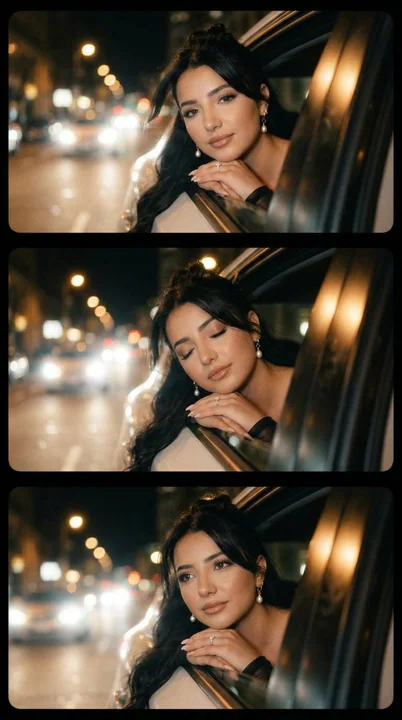 { "generation_request": { "meta_data": { "tool": "NanoBanana Pro", "task_type": "night_drive_filmstrip_3frame_micro_expression", "language": "zh-Hans", "priority": "highest", "version": "v1.0_NIGHT_CAR_WINDOW_FILMSTRIP_3FRAME_WARM_BOKEH" }, "input": { "mode": "image_to_image", "reference_image_usage": "maximum", "preserve_identity": true, "preserve_facial_features": true, "preserve_hairstyle": true, "notes": "以参考图为主要锚点。创建三帧水平胶片条(三个堆叠的宽屏帧)。同一位成年女性身份,相同的车窗构图,相同的夜间街道背景。每帧仅有微小的面部表情变化。暖钨丝路灯,柔和的胶片颗粒,散景车头灯,微妙的镜头眩光。无文字,无标志,无水印。" }, "output_settings": { "aspect_ratio": "9:16", "orientation": "portrait", "resolution_target": "ultra_high_res", "num_images": 1, "layout": { "type": "filmstrip", "frames": 3, "direction": "vertical_stack", "gutter": "thin_black", "outer_border": "none", "panel_consistency": "maximum" }, "sharpness": "soft_film", "grain": "true_film", "render_style": "cinematic_night_film" }, "scene": { "concept": "夜间驾驶电影胶片条", "environment": "夜间行驶的汽车,城市街道,远处的车头灯,路灯散景", "lighting": { "style": "暖色夜间街灯", "key_light": "钨丝路灯 + 车身柔和反弹光", "highlights": "皮肤和车漆上的柔和高光", "avoid": "闪光灯、日光、HDR" }, "camera": { "lens": "50mm 电影镜头", "look": "浅景深,奶油般散景,微妙的变形眩光", "focus": "眼睛和面部足够清晰,背景非常柔和" } }, "subject": { "type": "成年女性", "pose": "身体探出车窗,前臂搭在窗框上,头部靠在手臂上", "hair": "长长的深色头发散开,轻柔飘动", "makeup": "自然暖色妆容,柔和的唇色", "anatomy_rules": "正确的面部比例,逼真的手臂和手部,无扭曲的皮肤" }, "frame_directions": { "frame_01": "柔和的直接眼神接触,平静的梦幻表情", "frame_02": "眼睛轻轻闭合或半闭,宁静的睡意时刻", "frame_03": "眼睛再次睁开,略带忧郁的眼神,微妙的微笑容逐渐消失" }, "style": { "color_palette": "暖琥珀色路灯 + 深青色夜间阴影", "contrast": "低-中", "finish": "电影胶片扫描:柔和的光晕、颗粒感、轻微的暗角" }, "quality_control": { "identity_lock": "strict", "composition_lock": "maximum", "avoid": [ "changin"