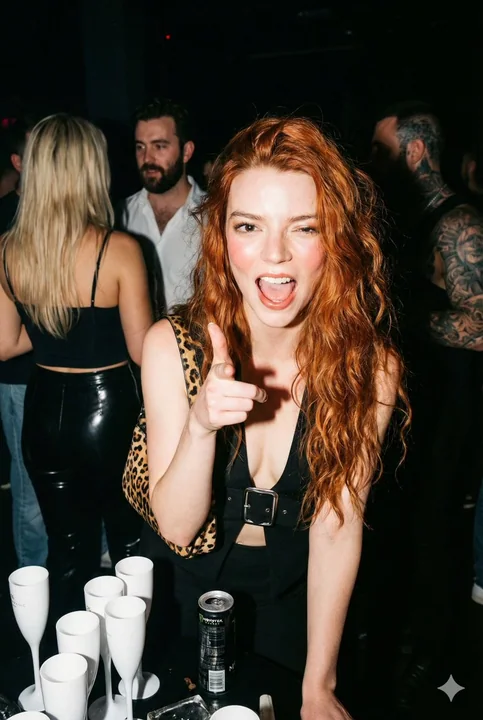 { "image_generation_prompt": { "subject": { "description": "Young woman with long, voluminous, tousled copper-red hair and fair skin.", "expression": "Energetic and playful face, mouth open in a shout or laugh, winking slightly, heavy blush on cheeks, glossy lips.", "pose": "Leaning forward towards the camera, right hand raised in a 'finger gun' gesture pointing at the viewer.", "attire": "Black sleeveless deep-v top with a large rectangular buckle on the chest, leopard print shoulder bag strap visible." }, "environment": { "setting": "Crowded, dimly lit nightclub or party venue.", "background_elements": [ "Woman with long blonde ponytail facing away in black top and shiny latex pants on the left", "Bearded man in white shirt on the right", "Heavily tattooed man in the deep background" ], "foreground_elements": "Table cluttered with white plastic champagne flutes and a black energy drink can." }, "technical_specs": { "resolution": "4K Ultra HD", "lighting": "Hard direct on-camera flash, high contrast, nighttime party lighting, harsh shadows.", "style": "Candid nightlife photography, paparazzi style, raw realism, hyper-detailed skin texture, slight film grain.", "camera_angle": "Eye-level, close-up shot." }, "full_prompt_string": "A hyper-realistic 4K candid nightlife photograph of a young woman with long, messy copper-red hair and heavy blush, leaning into the camera and pointing a finger gun at the viewer. She is wearing a black buckled top and a leopard print bag. The background is a crowded dark club with a blonde woman in shiny pants turned away and a bearded man. Foreground includes a table with white drinks. Shot with hard direct flash, high contrast, highly detailed skin texture, raw party atmosphere, 4k HD quality." } }
